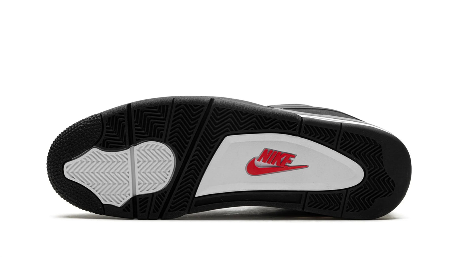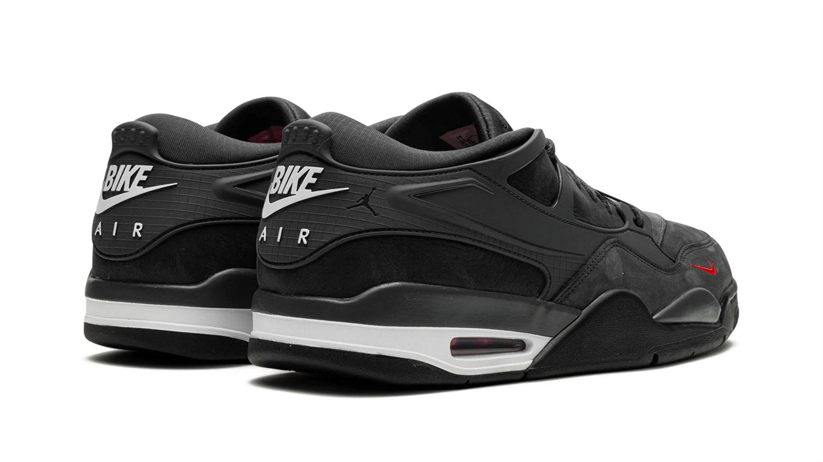 Anthracite-colored suede dominates the upper. while tonal TPU side panels with molded eyelets connect to the front lace system. Thin anthracite laces wind through the eyelets and keep the lightly padded tongue in place. Inspired by the original Jordan 4. the polyurethane midsole houses a visible air sole unit in the heel. which provides springy cushioning. "BIKE AIR" branding and a Swoosh logo in white decorate the heel near a small black Jumpman logo.